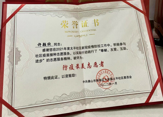 2019级视觉传达专业的许颖欣,自2020年以来,一直坚持参加“抗疫”志愿服务活动,至今已有两年。无论是防疫政策讲解,还是核酸检测、疫苗接种,都能看到她的身影。今年,她被南海区大沥镇太平社区委员会评为“防疫最美志愿者”。