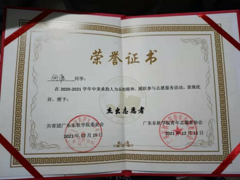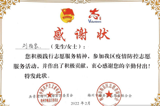 2021级环境设计专业的刘柏宏,在梅州市梅县区疫情防控志愿服务中表现积极,被共青团梅州市梅县区委员会及梅州市梅县区志愿者联合会授予“感谢状”。他表示,每一次参加志愿者活动,都能收获一种奉献的喜悦。