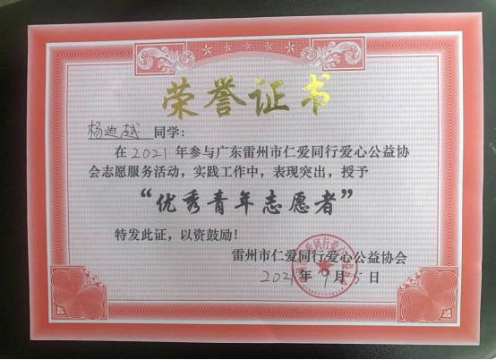 2019级环境设计2班杨迪越在学校时即表现突出,是一名光荣的入党积极分子。他表示,在疫情防控的紧要关头,作为一名入党积极分子要积极响应党和国家的号召,在人民群众需要的时候一定要做出回应,为人民服务。因表现出色,他被雷州市仁爱同行爱心公益协会授予 “优秀青年志愿者”称号。