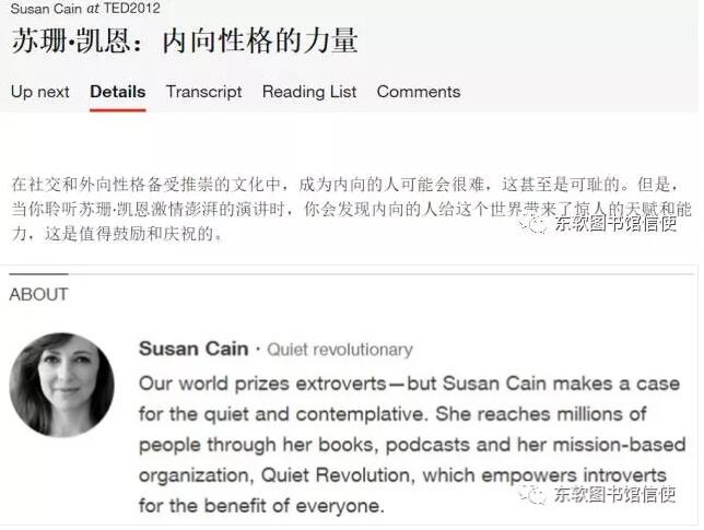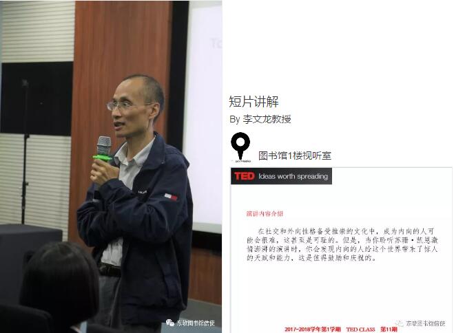 李文龙主任走进TED课堂,和您一起挖掘“内向性格的力量”。 发布时间:2017年12月07日 来源: 作者: 浏览次数: 次 【字体:小 大】 2017年11月08日,图书馆举办了第四周02期的TED讲堂,本期讲堂的主题是“内向性格的力量”,并特邀商务管理系系主任李文龙副教授为嘉宾主持人。为此,大量同学慕名前来,现场空前热闹。 The power of introverts 苏珊·凯恩:内向性格的力量 —by Susan Cain about the speaker 李文龙教授精彩的讲解 分享到: 【打印正文】