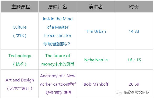 想了解更多的TED顶尖创意分享课堂的展映时间安排,请关注图书馆微信平台。