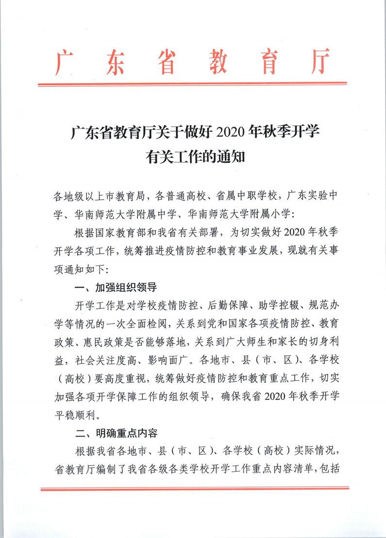 广东省教育厅关于做好2020年秋季开学有关工作的通知(盖章版)