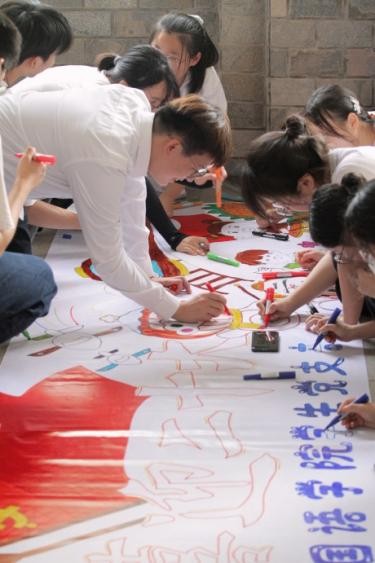 本次主题党日活动创新组织形式,支部成员根据路线图寻找打卡点,完成党史、团史和校史等相关知识问答的打卡任务,在寓教于乐中学习理论知识。在共同绘制“喜迎二十大”和“校庆二十周年”画卷的过程中,大家齐心协力,认真创作,作品融合了中华优秀文化元素、党史知识要点及外国语学院专业特点,展现出支部成员的蓬勃创作力。