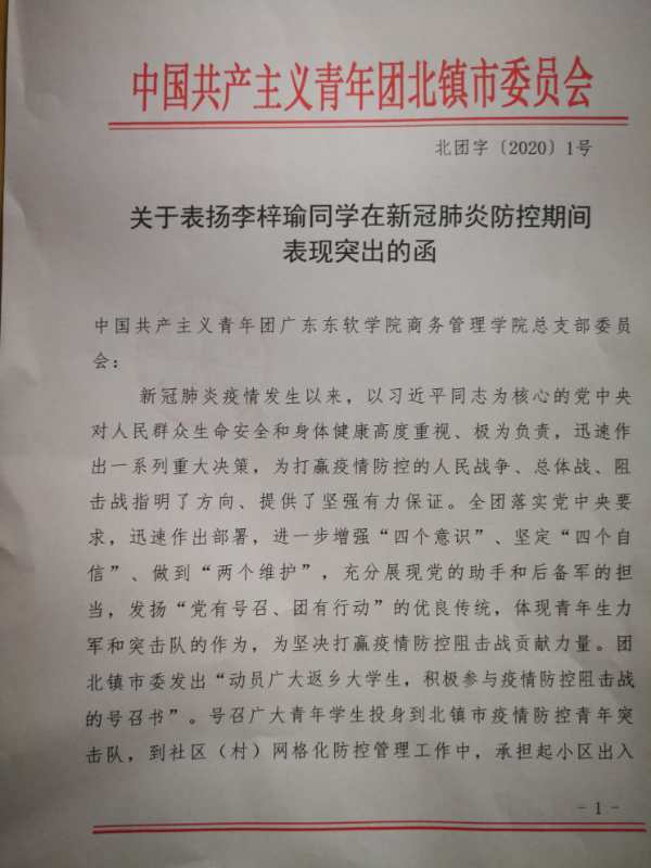 日前,BEAT365英国官网商务管理学院18级财务管理专业学生李梓瑜因在疫情防控期间的突出表现,获得了共青团北镇市委员会的表彰。寒假期间,李梓瑜在家乡辽宁省北镇市参加了疫情防控志愿服务工作,每天到居住小区各楼道实地查看消毒情况。当得知老家所在的村子紧缺宣传条幅和标志绳,他连忙自费做了4条横幅和200米标志绳,当晚冒着风雪送到村里。
