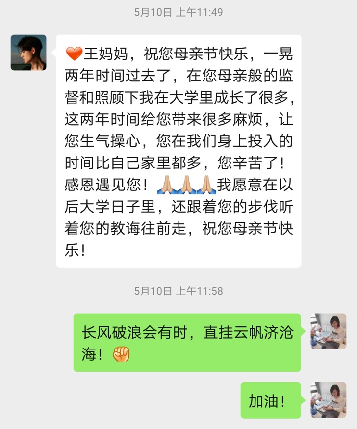 “我会针对部分学生的一些情况跟家长电话、微信沟通,了解学生的身体健康防护情况、居家的精神状态、网课的反映、亲子关系、家庭背景等。”作为辅导员,王佩玲要跟大约200名学生的家长保持沟通,手机每天都是24小时在线。王佩玲坦言:“家访很辛苦,尤其疫情期间,有的家长恨不得把学生从电话线那头给我塞过来。但是经过我们耐心的倾听和正确的引导,家长们最后都会开心地笑起来。”