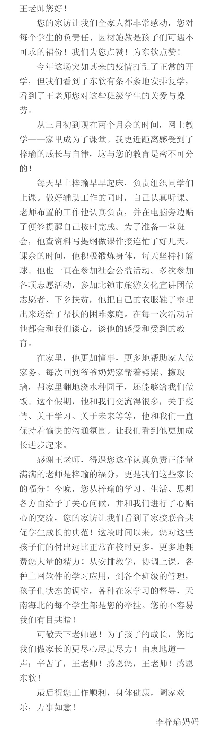 “您的家访让我们全家人都非常感动,您对每个学生的负责任、因材施教是孩子们可遇不可求的福分。”李妈妈在信中写道:“这段时间以来,您对这些孩子的付出远比正常在校时更多,更多地耗费您大量的精力!从安排教学,协调上课,各种上网软件的学习应用,到各个班级的管理,孩子们状态的调整,各种在家学习的督导,天南地北的每个学生都是您的牵挂。您的不容易我们有目共睹。可敬天下老师恩,为了孩子的成长,您比我们做家长的更尽心尽责尽力!”