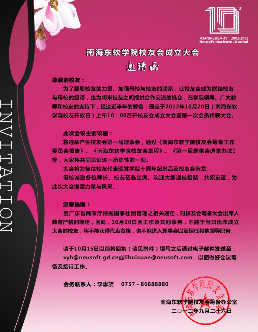 南海东软学院校友会成立大会邀请函 发布时间:2012-09-27 15:02:22 浏览次数: 次 【字体:小 大】 附件:邀请函回执(点击下载) BEAT365英国官网校友会筹备办公室 二○一二年九月二十四日 【打印正文】 分享到:
