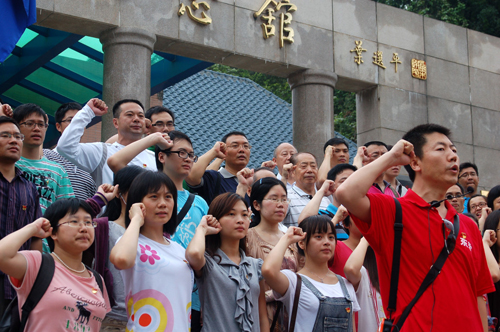 在东江纵队纪念馆前,党委书记齐志儒同志首先进行“三亮三比三评”活动动员讲话。齐书记指出,中央组织部、教育部党组把今年作为基层党组织建设年,开展“三亮三比三评”活动,是加强基层党组织建设的重要内容。通过开展此项活动,能使教师党员真正做到“教书育人,为人师表”,争当教书育人的表率,使教育教学质量更上一层楼;机关党员真正做到”认真服务、提高效率”,争当管理服务的表率,把机关真正建设成服务型机关,让群众满意;学生党员真正做到“品德优良、学习勤奋”,争当刻苦钻研、成绩优异的学习表率,使团员和同学们学有楷模,赶有目标,进而形成愈发浓厚的学习氛围。