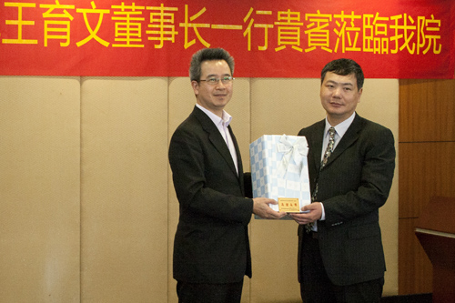 王育文董事长称赞我院的教学氛围、建筑风格和绿化环境。他介绍了育达商业科技大学的创校历程及现状,就接下来如何与我院开展学生互换、教师互访、系部合作、举行研讨会等与成顾问交换了意见。针对成顾问的邀请,王董事长认为可行,他表示育达商业科技大学鼓励学生参加比赛和实践,认为如此可以促进教学工作。