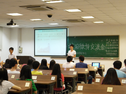 本网讯(记者 陈亨彦)5月23日晚,由联讯网络营销协会举办的校园微博交流会在B201教室举行,来自狮山大学城各高校的学生代表百余人就校园微博运营的相关知识和看法进行面对面的交流。