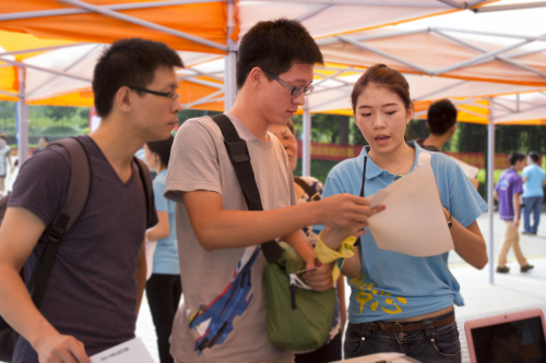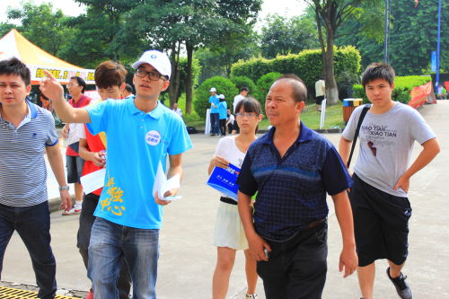 志愿者李聪介绍,为了迎接2013级新同学,共有110多名同学组成了志愿者团队,他们分为9个组,A座引导组,B座引导组,分流家长组,观光组,机动组,私家车引导组,快速通道组,外场组,和总咨询组。