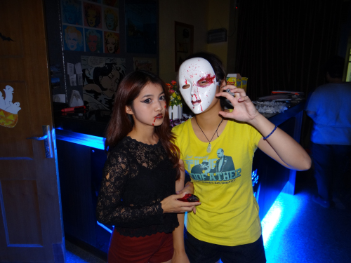 此外,很多“鬼怪”在AB栋中间游荡,让人尖叫不断。在AB座教学楼之间,活动参与者找到在隐藏在其中的“鬼”,就可以获得与“鬼”合影留念的机会并且可以获得一个印章。当印章达到一定数量,便可以换取纪念品。僵尸、吸血鬼、女巫,一群“妖魔鬼怪”们在校园穿行,尖叫声、欢笑声此起彼伏。同学们在亲身体验西方传统节日魅力的同时更加深了对西方文化的了解。