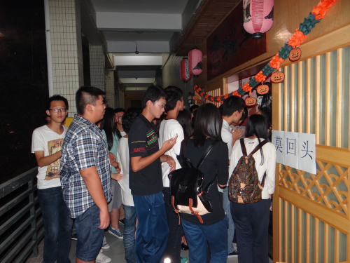 据英语角负责人陈俊霖介绍,本次活动主要分两个内容,一是闯关游戏,二是捉鬼游戏。活动中,同学们迫不及待地想与鬼有个亲密的接触,现场气氛十分活跃。同学们先是在咖啡厅通过模仿游戏获得线索到达乐樱堂,在乐樱堂门口猜中谜语之后就可以进入装饰成“鬼屋”的乐樱堂内进行一个“午夜拍肩莫回头”的游戏。乐樱堂门口可谓是人山人海,而里面却一片乌黑,一个“厉鬼”在台桌上坐着,不停地向同学们挥手,吓得大家拼命往后退。