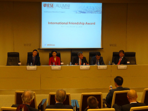 颁奖礼现场主持人、来自IESE商学院的雷诺教授(Prof. Pedro Nueno)在致辞中说,IESE商学院为了评选这个奖项,成立了一个评选委员会,从多位候选人中,根据他们在商业领域做出的贡献,最终确定了今天的五位获奖者。IESE商学院希望通过这个“国际友谊奖”肯定这几位中国的商业精英在国际商务领域做出的贡献。