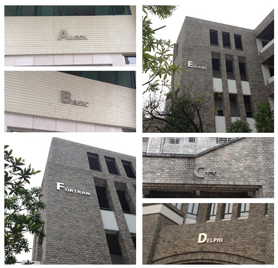 本网讯(记者 一湄)漫步在校园中,细心的同学已经发现原来的A座、B座、C座……教学楼群换上了新标签——A座(ALGOL)、B座(BASIC)、C座(C++)、D座(DELPHI)、E座(ERLANG )、F座(FORTRAN)。原来,这些重新命名的教学楼群,全部采用了计算机程序设计语言的名称。这些程序语言你认识多少?