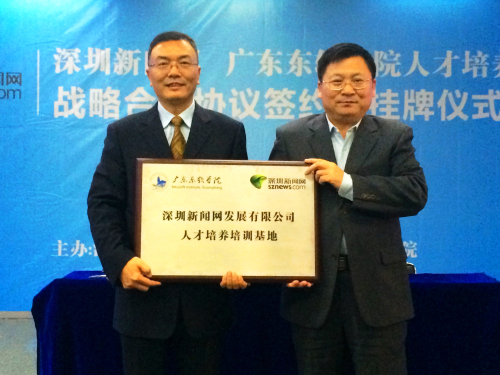 签约仪式上,杨利院长从胡宝祥副总编辑手中接过了“深圳新闻网发展有限公司人才培养培训基地”牌匾。