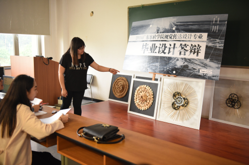 答辩分为答辩人陈述、作品展示、教室提问、点评4个环节。每位学生约有5分钟的演讲时间以PPT的形式对自己的毕业设计作品进行详细分析,并以各种形式展示自己的毕设作品,主要有装饰画,产品包装,服饰,包袋等。其中李晓婷设计的毛线装饰画倍受好评,熊丹老师夸赞她的作品有很强的视觉冲击力。另外,还有同学设计的环保手袋、背包,因清新的风格受学生盛赞。