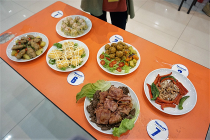 活动现场,决赛的七组学生选手纷纷亮出“看家绝技”,按照大赛主题——寻找家乡的味道,精心制作出了芝士炸番茄、红焖鸡翅、青椒炒鱿鱼、瑞典丸子、虾仁猪肉干蒸等7道各色美食,10余名师生评委代表就色、香、味、形进行点评和打分。最终,16级的朱小丹和梁丽怡组成的“I love you”小组制作的菜肴 “虾仁猪肉干蒸”获得了评委们一致的好评,赢得了比赛的第一名。