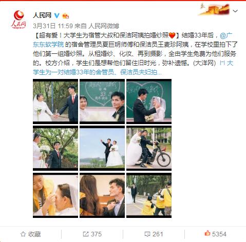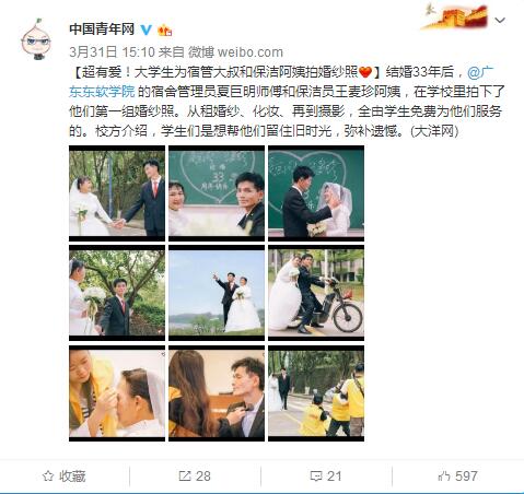 “这样的活动体现了学生们的爱心,这是件好事。”对于这组婚纱照的拍摄,党委书记左斌表示,学校一直以来都在强调对教职员工、学生的人文关怀,让教师成为温度的感受者,也成为温度的传递者,而学生如今也把这份温度传递给普通的劳动者。“希望看到更多的婚纱作品,比如还可以请自己的爸爸妈妈到学校,拍一组婚纱照。”对于接下来的计划,陈润坚称。