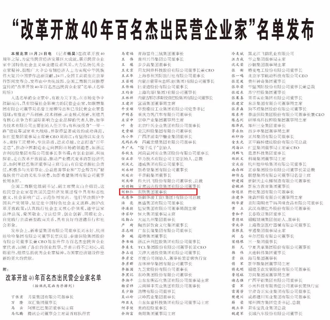10月24日,由中央统战部、全国工商联推荐的《改革开放40年百名杰出民营企业家名单》在北京发布,东软集团董事长兼CEO、学校董事长刘积仁博士获此殊荣,入选百人名单。