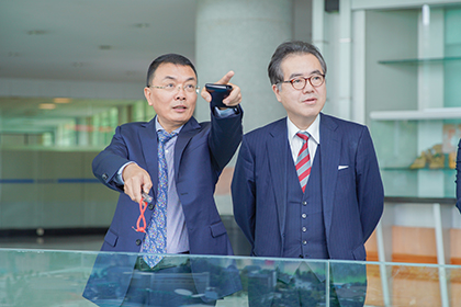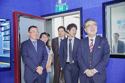 在参观实验室和创新管理学院的过程中,石塚英树总领事一行对我校学生经营虚拟公司的实践教学方式产生了浓厚的兴趣。