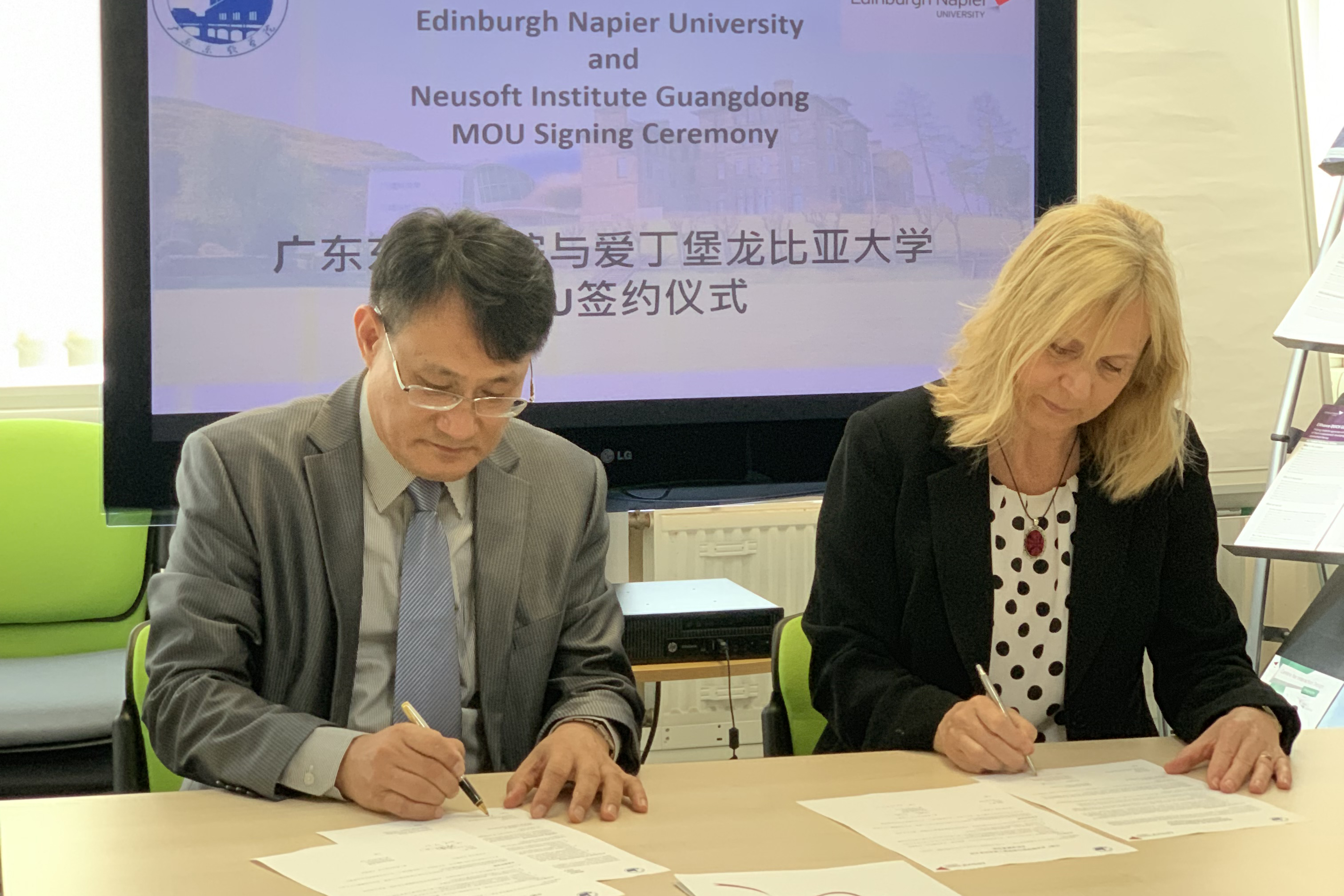 出访期间,蔡院长一行首站来到爱丁堡龙比亚大学,该校是英国苏格兰地区最大的公立综合性大学之一,其商学院被英国权威《卫报》(The Guardian)评为全英最优秀的年轻大学商学院,为爱丁堡乃至伦敦等世界金融中心输送毕业生。该校工程与计算机学院院长Alison Varey等校领导的对蔡院长一行的到来表示热烈的欢迎,首先感谢BEAT365官网为其输送了优秀教师——谭志远博士。谭志远博士在BEAT365官网毕业后,分别到澳大利亚、荷兰深造,博士毕业后在该校计算机学院任数据分析、网络安全方向的博士生导师。随后,双方就计算机专业学生培养、创新创业教育、教师科研、国际联合实验室建设等方面进行了广泛研讨,两校对今后的合作充满信心,并签订了合作备忘录。商学院学术副院长Grant MacKerron表示,期待今后在商学院认证、专业建设、学生培养、科研合作、教师交流等方面进行全方位的合作,助力BEAT365官网商科人才培养上台阶。