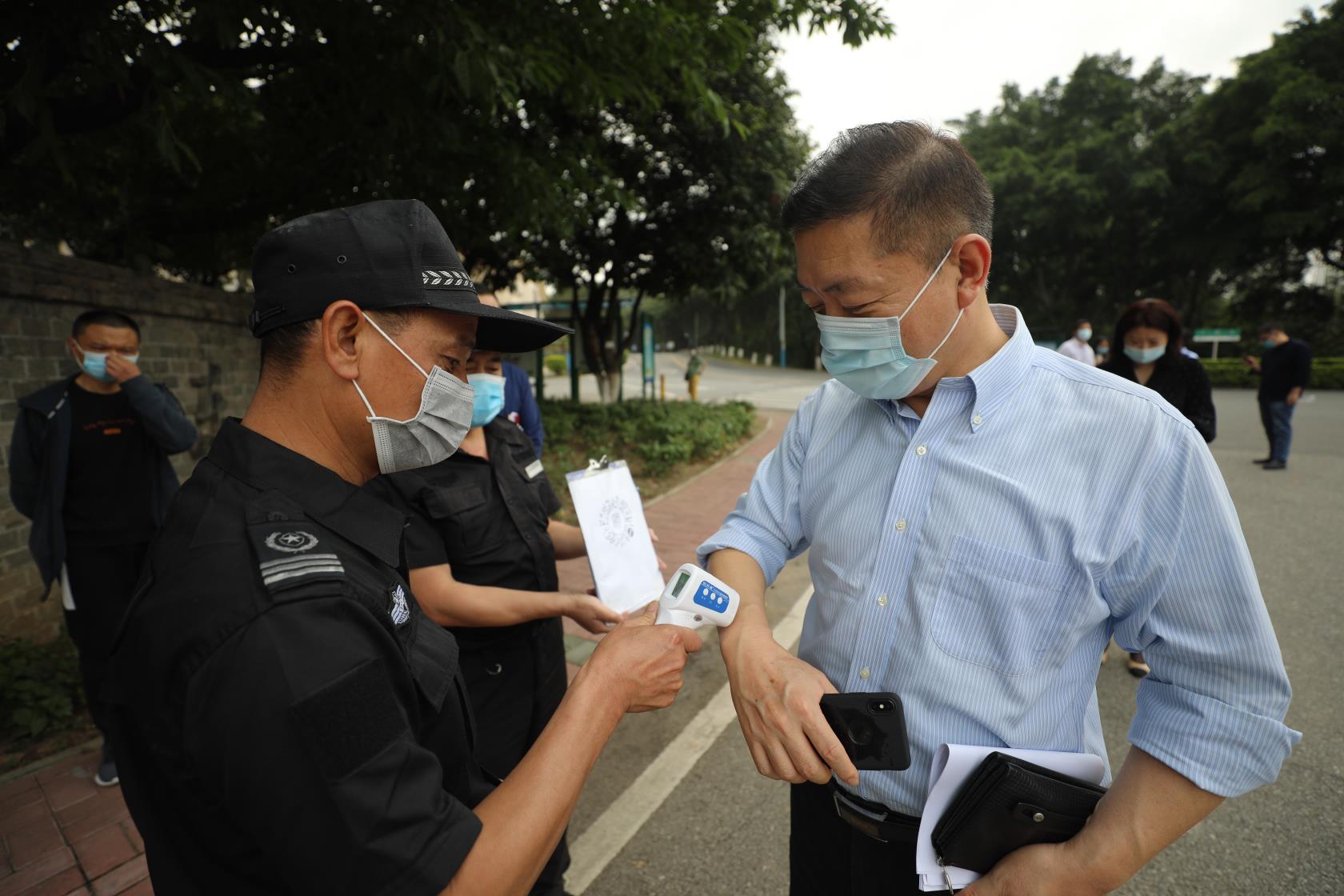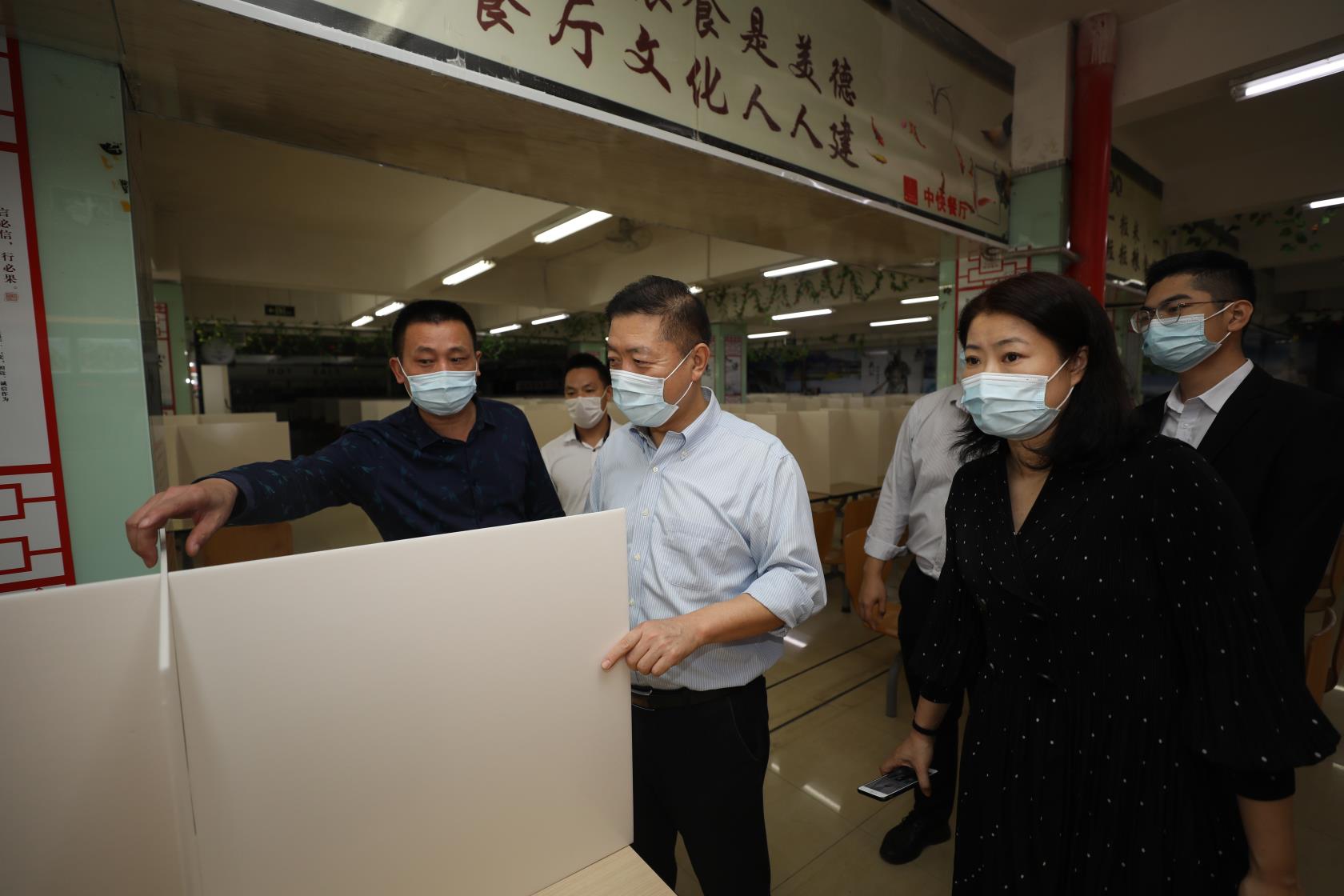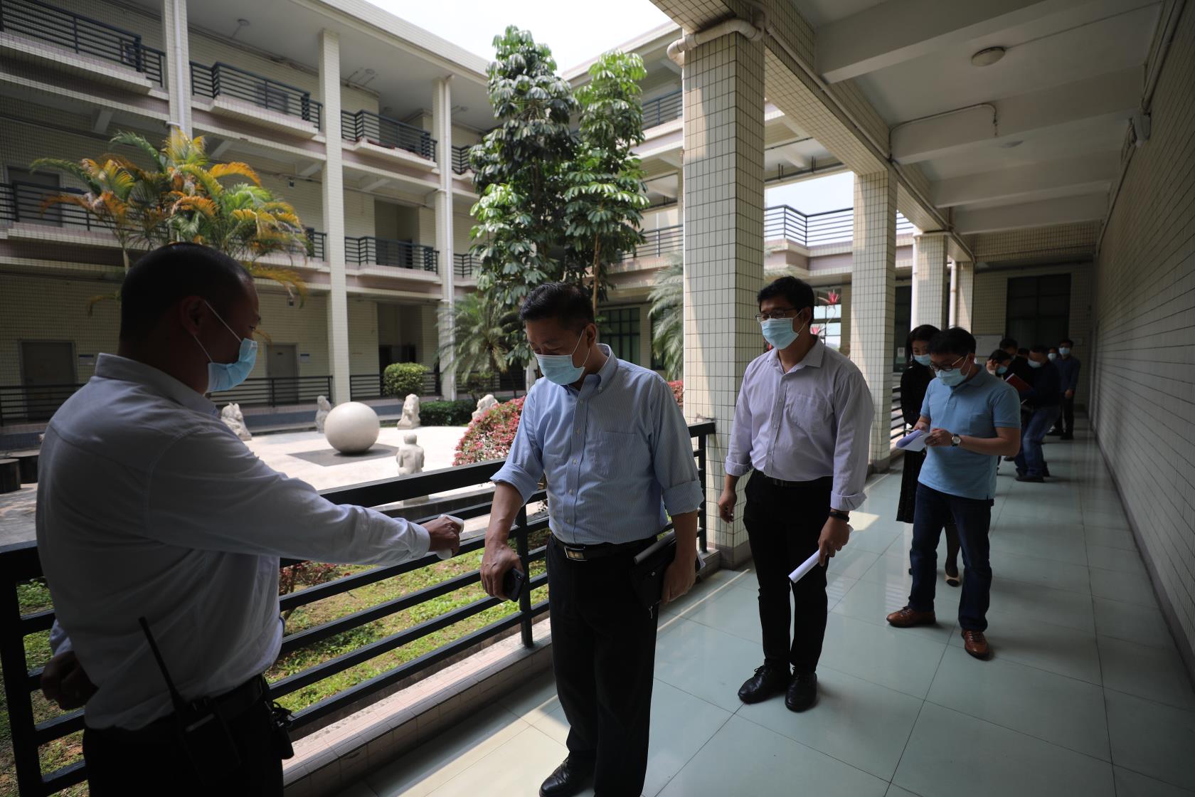 随后,王显卓副书记一行实地查看了学校大门口、防疫隔离区、教室、饭堂、校医室等重点场所,通过现场演练的方式,亲身体验了校园出入管理、体温检测、清洁消毒、学生上课、饭堂就餐等场景。从现场检查的结果来看,当前学校的疫情防控工作进展顺利,口罩等基础防护物资已有保障,疫情隔离区、学生饭堂等基本完成改造,医务室建设也在有序进行中,但针对大批量学生返校、突发疫情情况的硬件条件仍有欠缺。