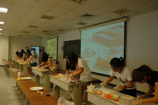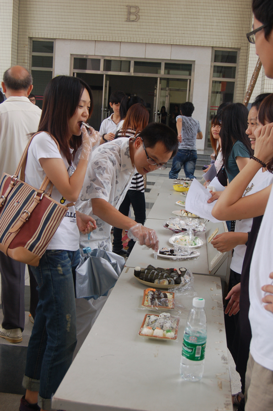 在“寿司日”活动现场,同学们早早把寿司制作用料准备齐全:海苔、饭团、馅料等等,一切准备就绪,整个活动现场处处洋溢着浓浓的节日气氛。选手们首先对原材料进行加工和分配,随后开始正式制作寿司。在竹排上铺海苔、铺寿司米、摆放原料、卷寿司以及切寿司,大家分工明确,互相合作,将蔬菜、肠仔合理地搭配在一起。虽然同学们的手法还不够娴熟,做出的寿司形态各异,但他们都在用心去诠释寿司,将时尚和创造带入到寿司制作中。不知不觉时间已过去一大半,选手们开始最后的装盘。不一会儿,一盘盘形态各异,花样繁多的寿司像一件件制作精美的工艺品被摆在桌上,让人垂涎三尺。随后大家将精心制作的寿司摆放在AB座长廊下,正值下课时分,闻讯赶来师生们一边品尝日本寿司,一边感受日本文化,师生不仅了解了日本饮食文化,而且一饱口福,大家乐此不疲。在整个过程中同学们不仅体会到共同制作寿司的乐趣,更感受到创意的魅力。一组选手不禁感慨:“这次比赛不紧增强了自己的动手能力,而且加强了自己的团队意识。”