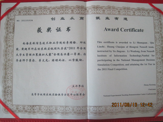 本网讯 “全国大学生管理决策模拟大赛”全国总决赛于7月17日—23日在重庆工商大学举行。我院信管系“东软宏锐”团队(指导教师:于景存、李文龙,队员09物流李顺铨、09工商邱林致、09工商黄超军)代表南方赛区参加了全国总决赛并荣获一等奖。