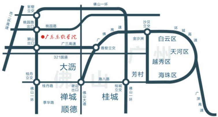 (2)华南快速往佛山方向(或广清高速)→广州白云区朝阳→广和大桥→佛山一环直行约20公里→狮山方向→佛山一环桃园路出口→右转直行约300米掉头→桃园路→穿过佛山一环桥底→直行约2公里红绿灯口→转右进入狮山大学城→绕湖直行约2公里到学校钟楼。